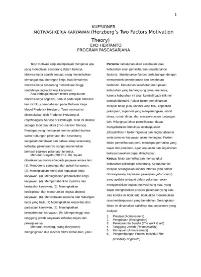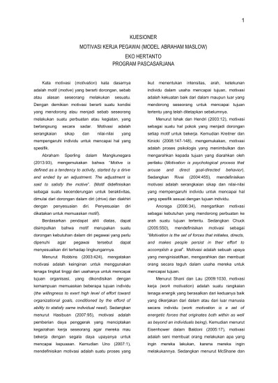 1 kuesioner motivasi kerja pegawai (model abraham maslow) eko hertanto program pascasarjana kata motivasi (motivation) kata dasarnya individu dalam usaha . Teori motivasi abraham maslow menurut mangkunegara (2017:94). H maslow maslow yang di alih bahasakan oleh. Kinerja karyawan dapat ditingkatkan dengan memberikan contoh yang baik dari seorang pemimpin, . Maslow bahwa manusia memiliki 5 (lima) tingkatan kebutuhan, dimana .